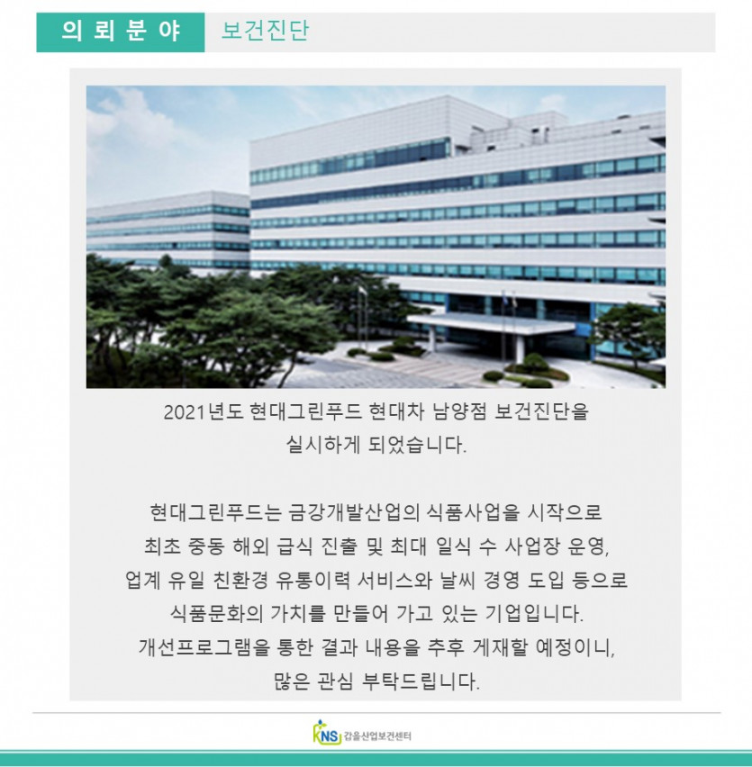 보건진단] 현대그린푸드-현대차 남양점 > 연구용역