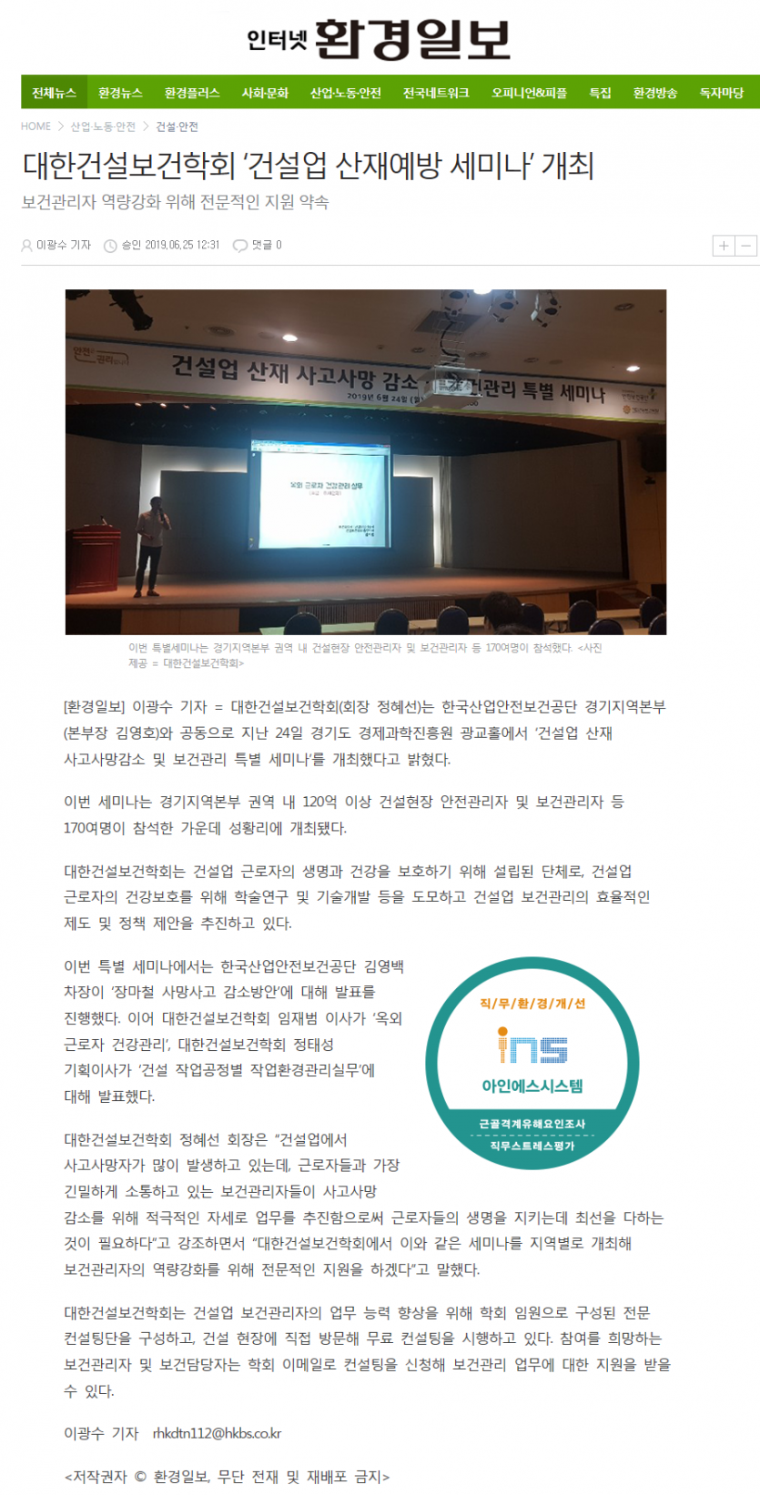 2019년도 대한건설보건학회 "건설업 산재예방세미나'에서