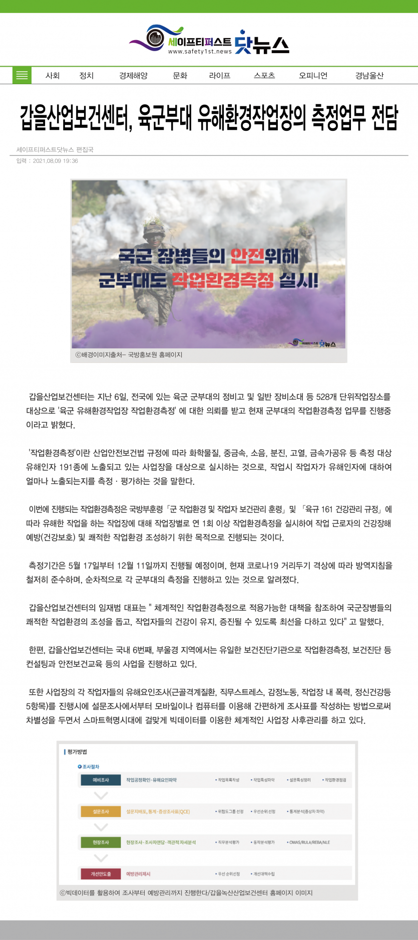 세이프퍼스트닷뉴스] 갑을산업보건센터, 육군부대 유해환경작업장의 측정업무 전담 > 공지사항
