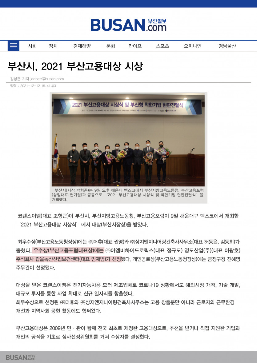 부산일보] 부산시,2021 부산고용대상 시상 - 우수상에 갑을녹산산업보건센터 수상 > 공지사항